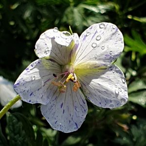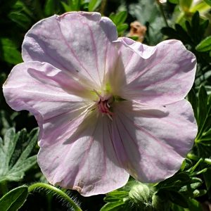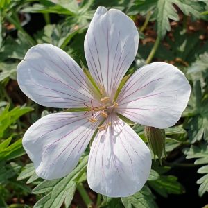 A really striking geranium which forms mounds of deciduous mid green foliage & produces masses of white flowers with lavender streaks from early summer. Deciduous & fully hardy. Happy in most moderately fertile, moist but well-drained soils in full sun/part shade. HGT 60cm