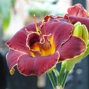 A dramatic clump forming perennial with fresh green, strappy foliage that produces spikes of large, raspberry red flowers with a dark, ruffled edge & a yellow centre throughout summer & autumn. Fully hardy. Prefers fertile, moist but well drained soil in full sun/part shade. HGT: 60cm