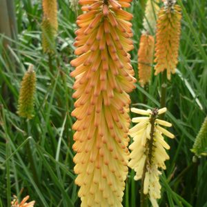 An unusual form of ‘Red Hot Poker’ forming an upright, semi-evergreen clump of grey-green, strappy foliage & producing tall, egg shaped spikes of fiery orange, yellow & red flowers in late summer. Prefers moist but well drained soil in full sun/part shade. Fully hardy. HGT 1.2m