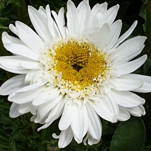 A lovely form of this cottage garden favourite, producing masses of large double white ‘daisies’ with yellow centres and a ring of shaggy white petals throughout late summer. Prefers fertile, moist but well-drained soil in full sun or part shade. Deciduous & fully hardy. HGT 75cm