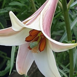 Rarely offered, this striking alpine lily produces several long, trumpet shaped, white flowers heavily flushed with maroon on the outside and a strong fragrance. Fully hardy. Prefers well drained soil in full sun.