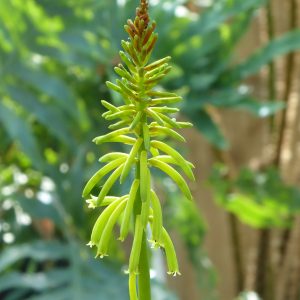 An upright, semi-evergreen, clump forming perennial with grey-green, strappy foliage that produces tall spikes of creamy flowers with an orange tinge at the top of the spike in late summer. Prefers moist but well drained soil in full sun/part shade. Fully hardy. HGT 1m
