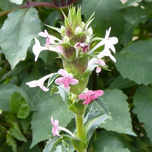 An elegant, evergreen perennial having fragrant, spiny, dark-green foliage and producing tall spires of whorls of white flowers that turn pink once fertilised in summer. Prefers well drained soil in full sun or part shade. Fully hardy. HGT 90cm
