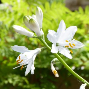 A rarely offered form of this early summer flowering perennial that produces tall spikes of trumpet shaped snow white flowers above mid-green, sword -like foliage. Prefers moist but not wet soil in full sun. Hardy & deciduous.HGT: 90cm