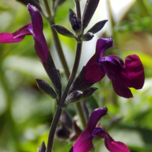 A lovely, evergreen, woody perennial with aromatic, slightly hairy, mid-green foliage that produces tall spires of dark maroon-purple, ‘hooded’ flowers throughout summer. Happy in well drained soil in full sun.