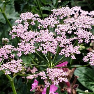 A beautiful form of pink ‘cow parsley’ producing flat heads of tiny pink flowers over ferny foliage from late spring to early summer. Butterflies love this plant. Prefers a damp soil in full sun. Deciduous & fully hardy. HGT 1.2m