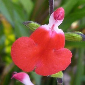 A lovely, evergreen, woody perennial with aromatic, glossy, mid-green foliage that produces masses of bi-colour, bright red & white, ‘hooded’ flowers throughout summer. Fully hardy in full sun and well drained soil Still the one everybody wants! HGT 1m