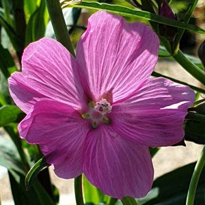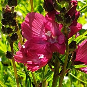 A cottage garden favourite with mid-green, deciduous foliage and producing spires of rose pink, cup shaped flowers throughout summer making it look like a miniature hollyhock. Prefers moderately fertile soils in full sun. Fully hardy. HGT 1.2m